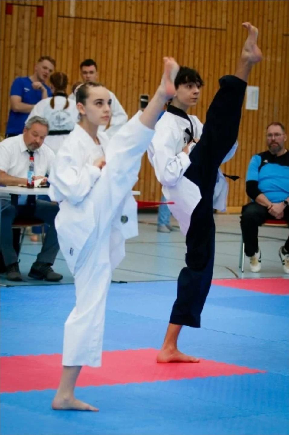 Während sich Isabel (3.KUP) in der Nachwuchsklasse noch auf ihren Formenpool einstimmen konnte, um sich dann in acht Wochen auf der Nordbayerischen der Qualifikation zu stellen, war es für Leyla (2.KUP), Julia (2.KUP), Fabio (2.KUP),