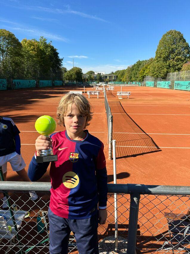 Gleich um 9:00 Uhr startete bei frischen Temperaturen, aber weißblauem Himmel das Endspiel der U10 zwischen Niel Singh und Jakob Thelen. Bereits dieses Spiel war so eng, dass der Sieger erst nach dem Gewinn des Matchtiebreaks feststand: nach fast 2 Stunden konnte Jakob ganz stolz seinen Pokal präsentieren (6:4,4:6,10:6).